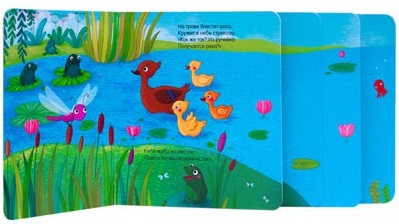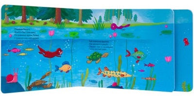 Создавая вторую книгу - "Кто живет в реке?" - мы повернули макет на 90 градусов, и по страницам побежала река. Над ней закружилась любопытная стрекоза с вопросами: Где берет начало река? Куда она течет? И есть ли у нее конец?