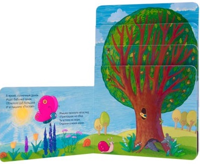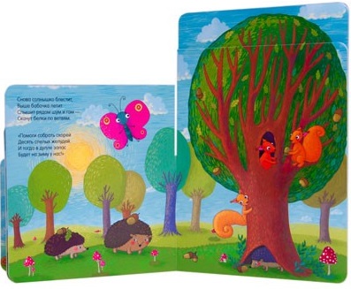 Началось все с макетов и эскизов. На страницах книги "Кто живет в лесу?" вырос высокий дуб, в котором на разных "этажах" поселились звери и птицы. Затем с цветочка впорхнула милая бабочка и полетела с ними знакомиться.