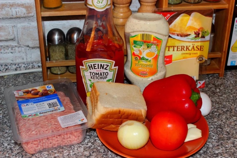 С начала кетчуп, затем репчатый лук, майонез или соус из сметаны, порезанный помидор, опять майонез или сметанный соус и сыр