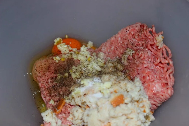 Хлеб размачиваем в молоке и смешиваем с фаршем, добавляем, соль, перец, мелко порезанный чеснок и яйца, хорошо перемешиваем, пока масса не станет однородной и более клейкой