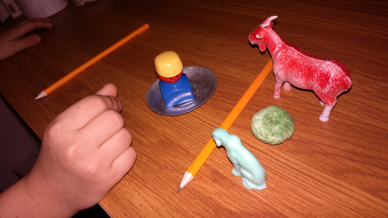 И как только я предложила сделать сыну берега в разных комнатах, и он побегал с лодкой туда-сюда, то понял как решать задачку.