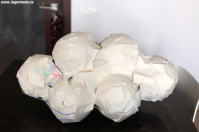 2. Берете газету, воду, клей ПВА. Смачиваете куски газеты в воде, чуть промазываете наспех клеем и обклеиваете шары, чтобы получилось папье-маше в виде тучи.