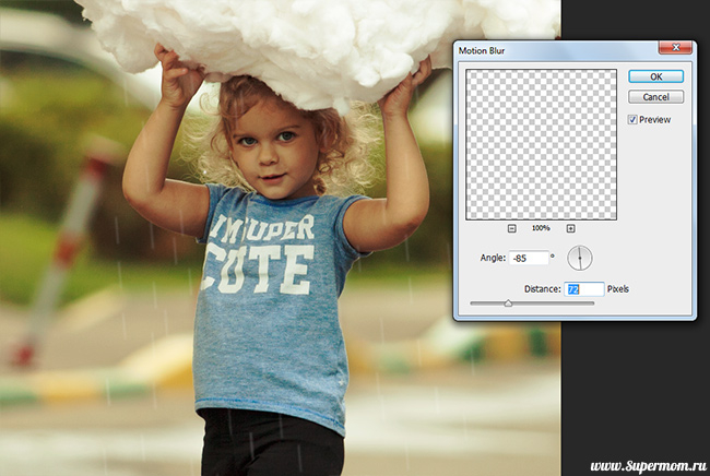 4. Затем заходите в Filter > Blur > Motion Blur. В появившемся окне всего две настройки - направление и сила смещения. Думаю, вы сами тут разберетесь.