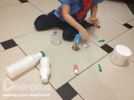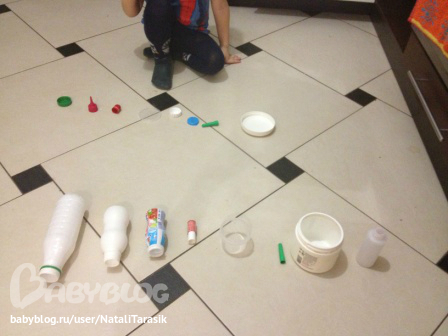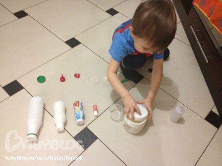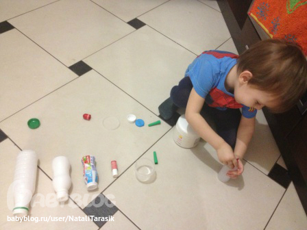 Дальше - больше. Собрала все бутылки и емкости дома и предложила подобрать крышку! У всез ведь дома есть разные по размеру, обьему и величине бутылки, попробуйте - это весело!!!