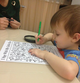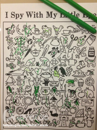 Как всегда занятия на внимание. Нужно найти все живое на картинке и отметить зеленым фломастером. В помощь пришла лупа.