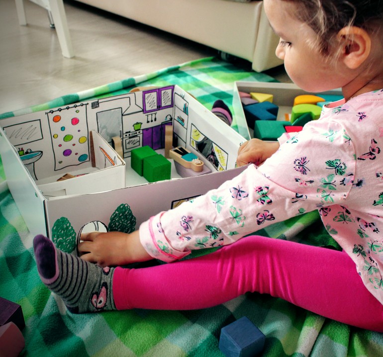 И в очередной раз, картонная упаковка для хранения была порвана, Мироша с досадой сообщила "Ну чтож поделаешь, придется выбросить!". На что я задумала и предложила поиграть в домик из картона.