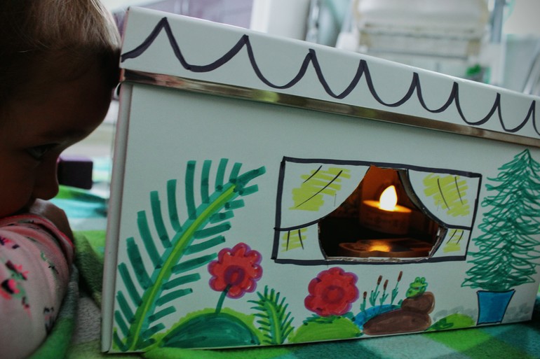 А когда станет темно, можно в домик поставить свечку на батарейке (у нас икеа), и наслаждаться теплотой домашнего очага через окошки.