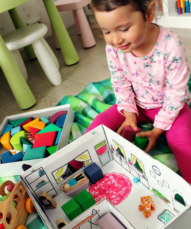 Идею она встретила с воодушевлением. Хочу отметить, что до этого она не особо играла в "домики", может потому что не дозрела, поэтому я и не покупала и просила не покупать подобные игрушки нам в подарок, т.к. лежали бы без дела. Теперь я понимаю, что имеет смысл понаблюдать, дождаться пока эта коробка придет в негодность и потом задуматься над покупкой более практичного кукольного домика. В общем я быстро нарисовала кое-какие окошки, дверку, что-то еще ... и понеслось. Но поскольку та коробка была действительна маленькой, туда помещалось максимум 5 гриммовских кубиков, в ночи было принято решение сделать домик побольше.