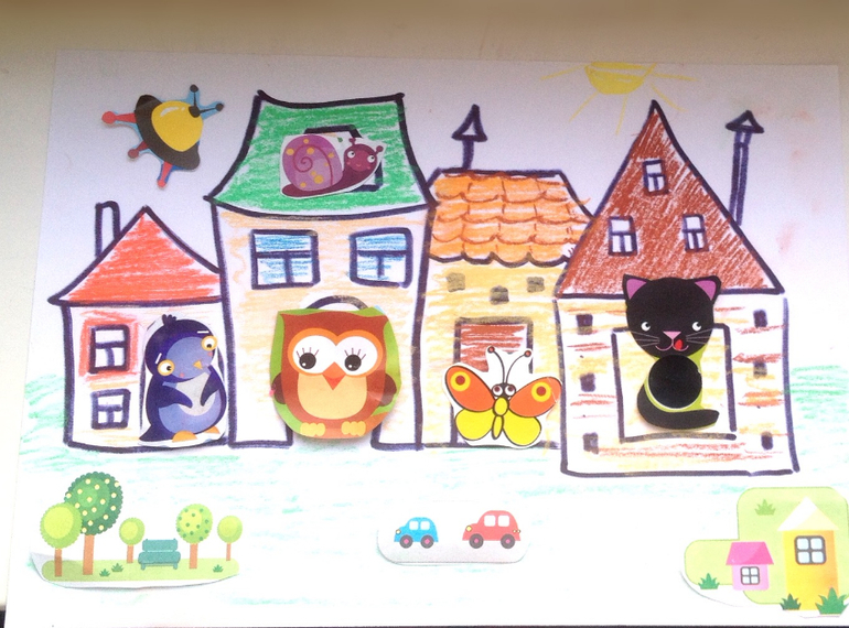 Когда мы закончили заниматься по книжке, я просто так книгу не выбрасываю, а сначала вырезаю оттуда картинки и складываю в коробочку. Когда ребенок требует клеить аппликации, то всегда под рукой эта коробочка. Я быстренько рисую фон - домики, дорогу или еще чего-нибудь, и Тимошка приклеивает туда зверюшек.