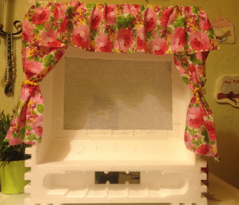 Сам "театр" я сделала из большого пенопласта (остался от принтера), вырезав в нем дырку. И украсила занавесочками. А экран сделала из белой ткани. Можно сделать из картона, как ширму. Потом легко сложить и убрать. Сзади светит обыкновенная настольная лампа.