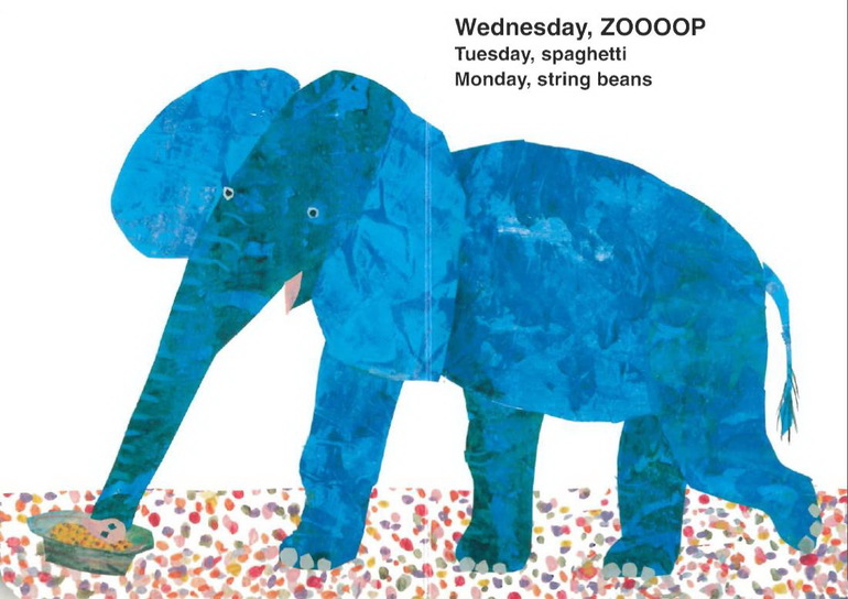 Я думаю, Эрик Карл с его незамысловатым текстом и нарочито детскими иллюстрациями узнается без труда. В "Today is Monday" он помогает детишкам усвоить дни недели и заодно изучить различные виды блюд.