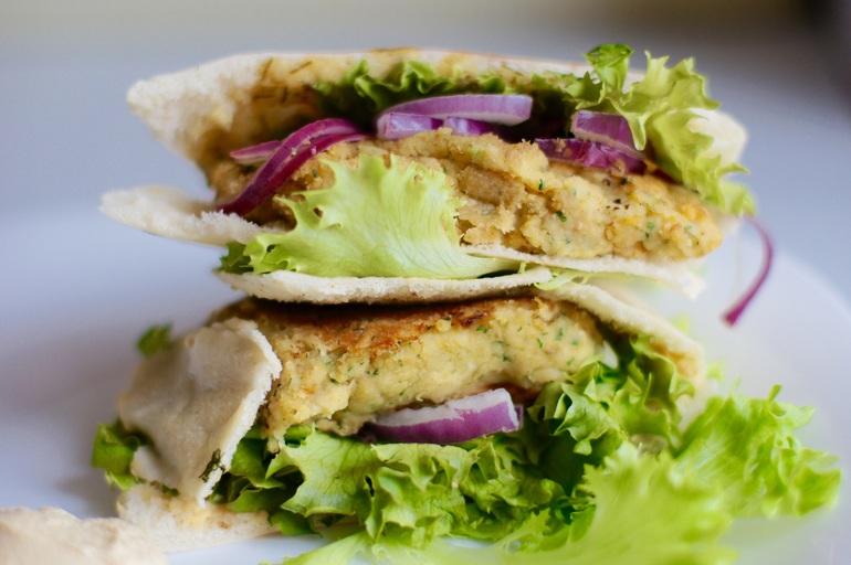 Формируем из хумуса котлеты, поджариваем их на сковороде можно с небольшим количеством масла, можно без масла. Питу разрезаем пополам и греем на сухой сковороде. Горячую питу смазываем тхиной или чуть промазываем хумусом. В половинку питы кладем листья салата, немного лука, помидор и теплую котлету.