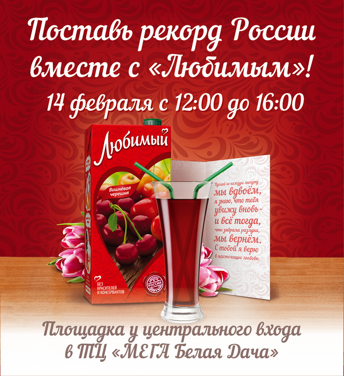 14 февраля, в День всех влюбленных, бренд натуральных соков и нектаров «Любимый» призывает всех открыто говорить о своих чувствах и признаваться друг другу в любви. А чтобы этот день запомнился еще больше, все влюбленные приглашаются к участию в установке рекорда России на самое большое количество валентинок - предстоит собрать 1001 любовное признание! По этому случаю с 12:00 до 16:00 часов в торговом центре «МЕГА Белая Дача» (на площадке у центрального входа) состоится праздничная акция «Сердце России». Каждый желающий сможет разместить свое признание в любви на огромном арт-объекте, символизирующем сердца влюбленных.