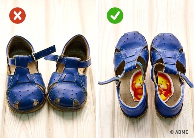 Детки 2-3 лет (да и постарше) частенько путают правый и левый ботинки. Разрежьте наклейку с любимым героем пополам и наклейте внутрь обуви - это облегчит жизнь всем.