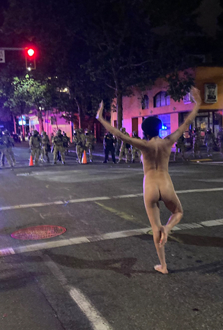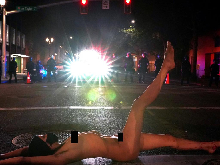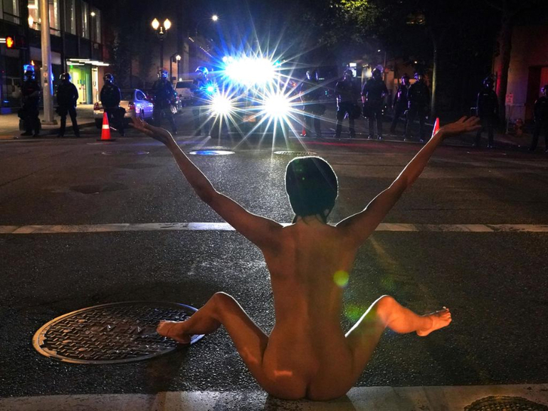 Полицейские стреляли перцовыми шариками ей в ноги и к женщине подбежал другой демонстрант с самодельным щитом, но она обошла его стороной. По словам фотографа, полицейские ушли примерно через 10 минут после того, как появилась «голая Афина».