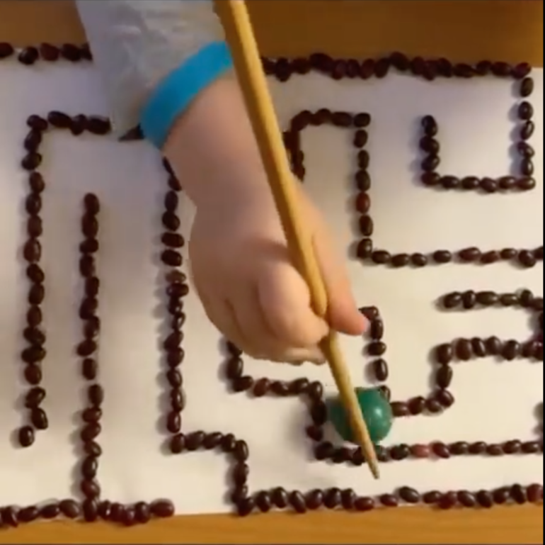 1. Делаем лабиринт. Для этого можно использовать, все, что нашлось дома: фасоль, пуговки, пластилин, тесто для лепки или фигурки Лего.