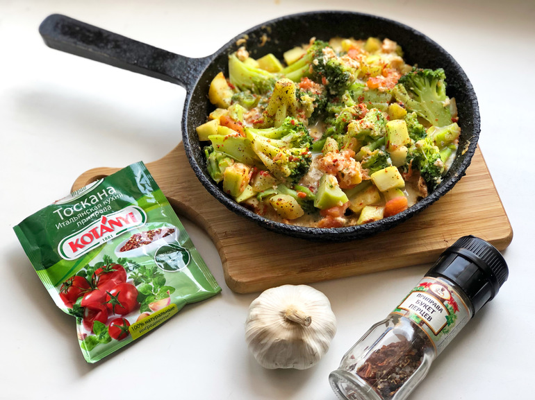 Брокколи отварить в подсоленной воде. Помидор и цуккини порезать мелкими кубиками, положить в сковороду и обжаривать немного в масле, посолить и поперчить, тушить в среднем 3-5 минут. Добавить отварные брокколи, выдавить зубчик чеснока, все смешать, добавить яйца, убавить огонь, закрыть крышкой, через пару минут выключить огонь и дать ещё пару минут постоять под крышкой. В конце я посыпала моей любимой приправой kotanyi Тоскана, она с томатами и чесноком, мне нравится.