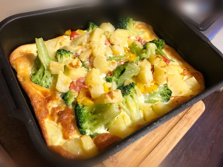 Брокколи отварить в подсоленной воде 3-5 минут. Порубить перец мелко, картофель, с помидора снять кожицу и тоже измельчить. Яйца взбить со сливками, добавить соль, чёрный перец по вкусу. В форму капнуть масла, выложить произвольно овощи, залить яичной смесью. В духовку на самый сильный огонь на 10 минут и готово!