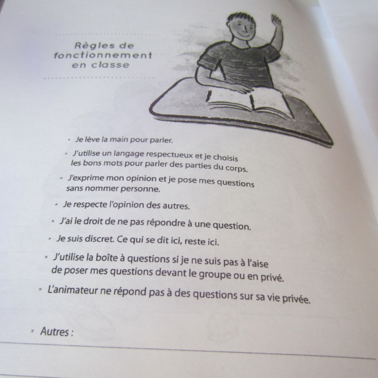 Здесь говорится про правила урока: употреблять норм. слова, уважать мнение других, право не отвечать на вопрос, всё, что говорится на уроке, остаётся на уроке, использовать ящик с вопросами, если неудобно задать вопрос напрямую и тд