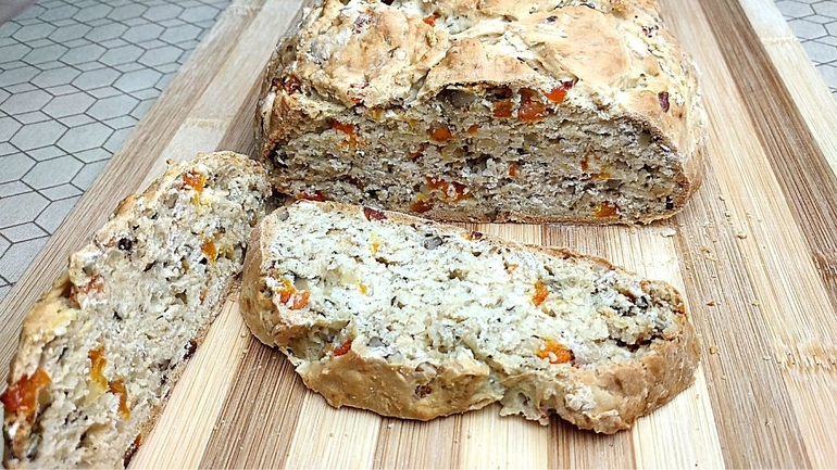 Быстрый рецепт выпечки домашнего хлеба без дрожжей, с грецкими орехами и курагой.