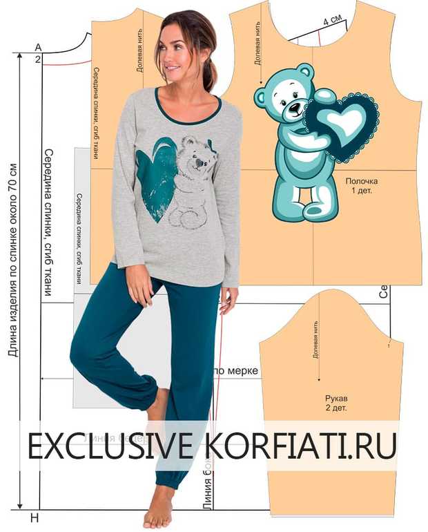 Как приятно после долгого насыщенного событиями дня и вечера надеть на себя мягкую комфортную пижаму, укутаться в одеяло и окунуться в мир сладких снов. Пижама из натурального материала непременно должна быть в гардеробе каждой женщины. Ведь хороший сон - это не только залог отличного настроения, но и женской красоты. Недаром многие производители кремов для лица приравнивают их действие к восьми часам здорового сна. Понимаете теперь как важен крепкий сон для нашего организма? А чтобы вам хорошо спалось, предлагаем сшить себе пижаму из натурального хлопчатобумажного трикотажа, украшенную принтом с милым медвежонком. Такая пижама создаст настроение, и вам будут сниться только романтические волшебные сны.