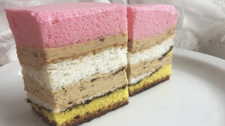 Выпеченный корж разрезать на две части. Выкласть крем на первый корж, накрыть вторым, сверху выложить оставшийся крем, разровнять и на него выкласть суфле.