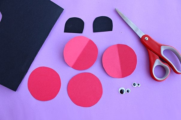 Чтобы сделать одну такую божью коровку, вам надо будет вырезать из бумаги красного цвета три одинаковых кружочка. Согните каждый кружок пополам и нарисуйте на них фломастером черные точки. Теперь склейте кружочки между собой боковыми сторонами. Из бумаги черного цвета сделайте божьей коровке голову. Усики и лапки дорисуйте фломастером.