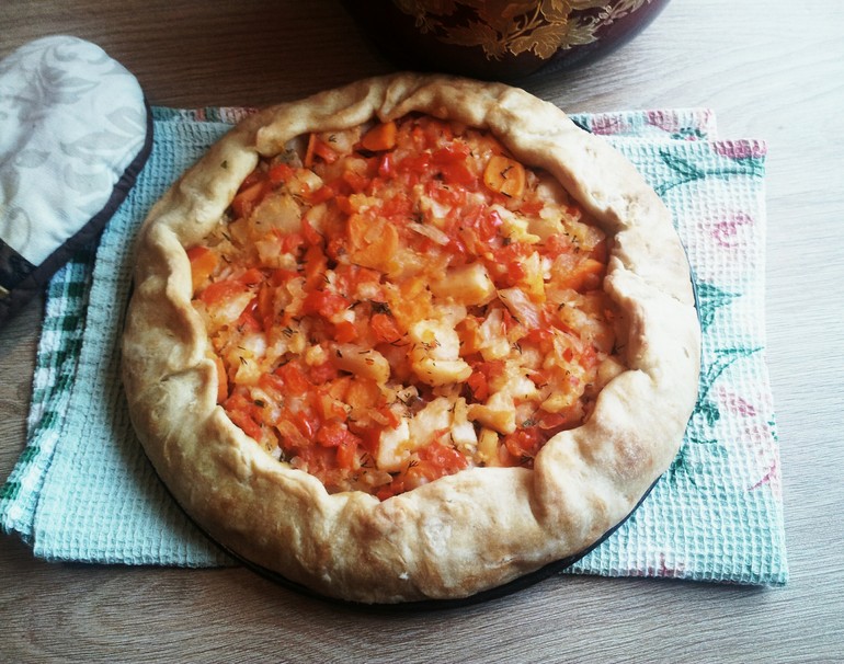 Вымесить тесто, скатать в шар, завернуть в пищевую пленку и убрать в холодильник на 30 мин. Начинка может быть любой. У меня здесь тушеные овощи (болг. перец, помидорка, лук, морковь, зубчик чеснока) и отварной картофель.