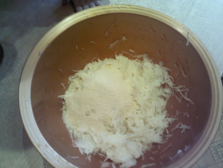 Лук трем на самой мелкой терке, затем трем картошку, я тру на средней терке.Когда тру картошку перемешиваю ее с луком чтоб не темнела. Натерли картошку, добавляем соль и манку.