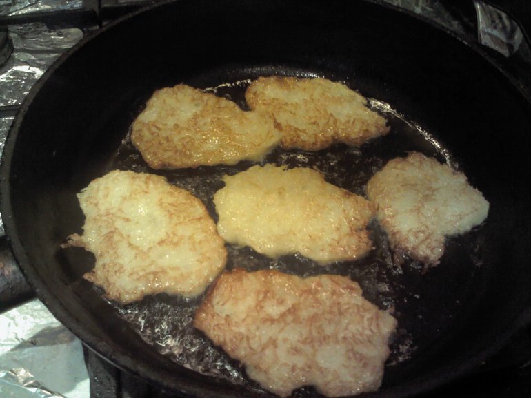 Вот и все, можно жарить! Разогреваем сковороду с маслом и ложкой выкладываем наши драники придавая им форму.