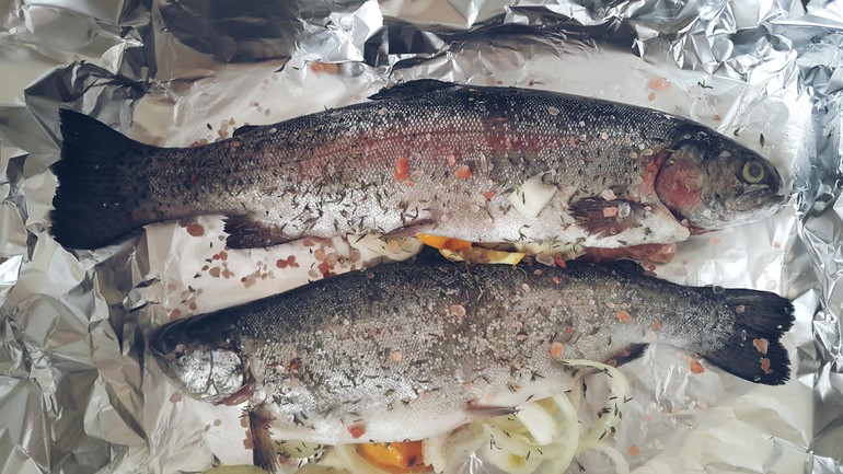 Нафаршировать форель, облить остатками лимоного сока. обтереть тимьяном, сверху на кожу посыпать соль, лучше крупную. Завернуть в фольгу. Поставить на 10-12минут в разогретую до 180 духовку, затем раскрыть фольгу и подержать еще минут 7-9 до получения корочки на рыбке.