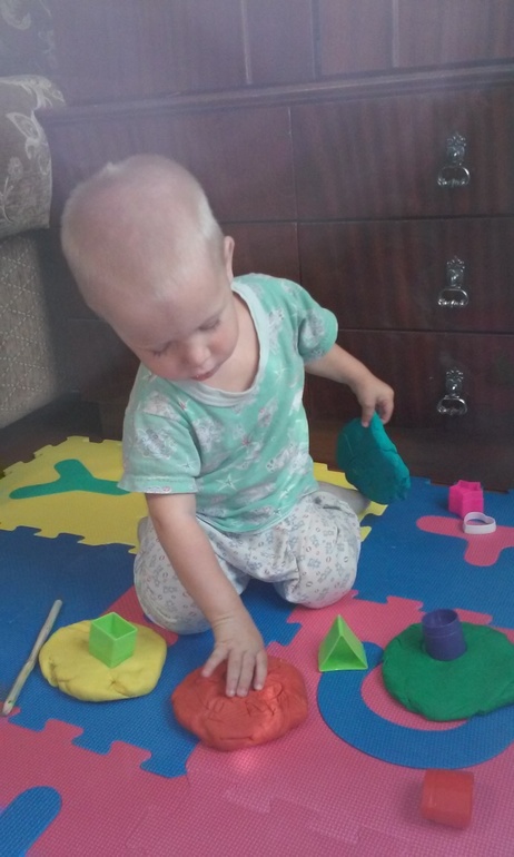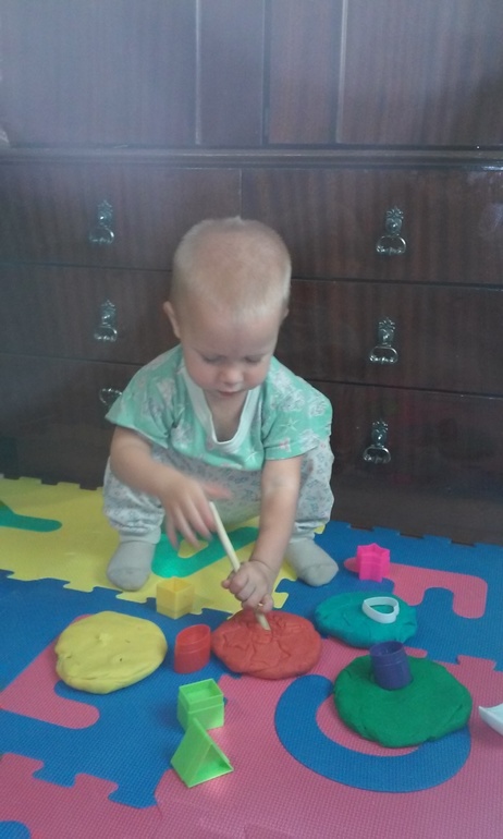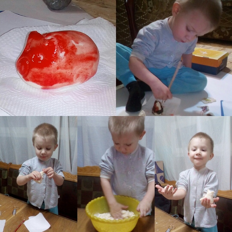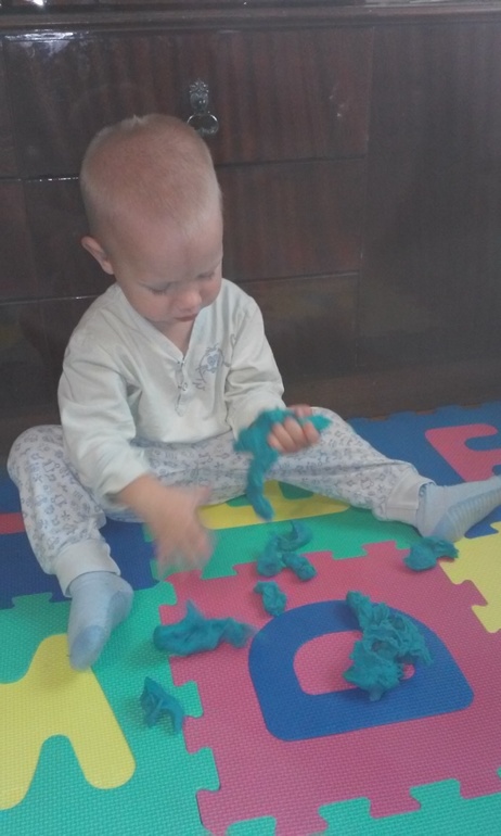 Как играть ? Так же как и с пластелином, только не боятся что малыш может съесть (пластелин гораздо опаснее ), вещи и мебель испорчены не будут, тесто легко убирается приклеиваясь к другому кусочку теста с любой поверхности. Можно рвать, тыкать палкой , делать на тесте отпечатки руки или фигурок и просто лепить