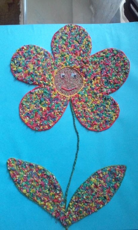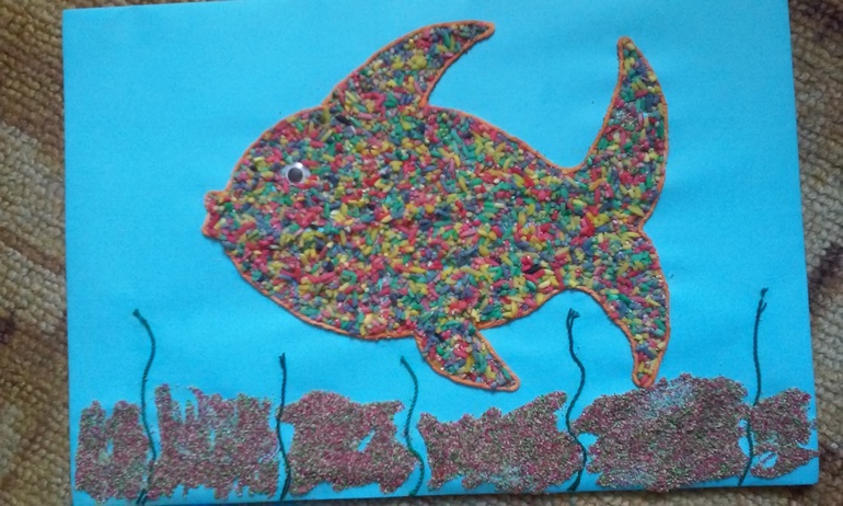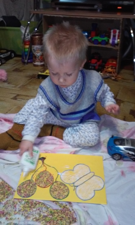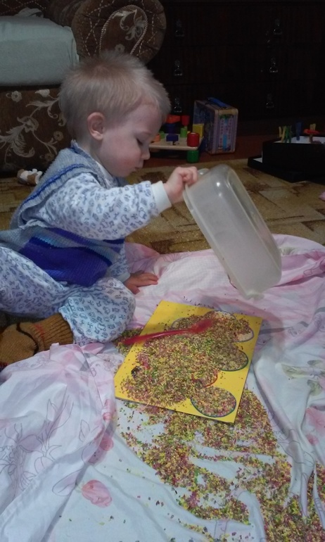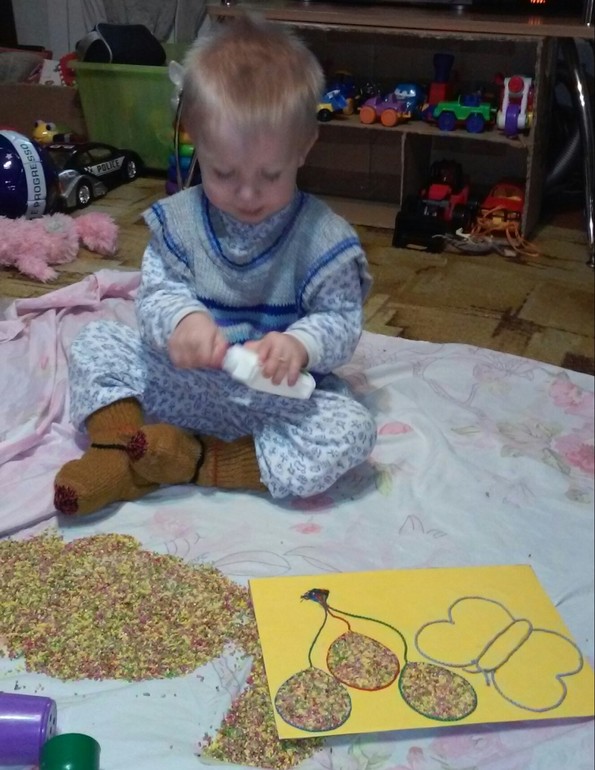 Примерно в 1,10 мы начали делать поделки. Сначала я делала заготовку. Цветную бумагу приклеивала на картон и рисовала контур поделки. Далее нужны толстые цветные нитки (делала жгуты из обычных ниток, а иногда использовала нитки для вязания ), нитку клеила по контуру рисунка. Когда все подсохло в работу включался ребенок. Клеем жидким пва ребенок зарисовывал внутри контура, потом засыпал рисом или манкой, придавливал ручкой и откладывал для высыхания (терпения у ребенка мало поэтому лучше делать сразу 2 апликации , пока одна сохнит минут 5-10 ребенок занят второй ) После нужно просто стряхнуть лишний рис, но не рукой , а постучав боком поделки и лишнее само отпадет . Не нужно расчитывать на то что у ребенка все будет идеально красиво и аккуратно, вооружитесь тряпочкой и в процессе сами подтирайте лишний клей, главное не мешайте ребенку и хвалите его.