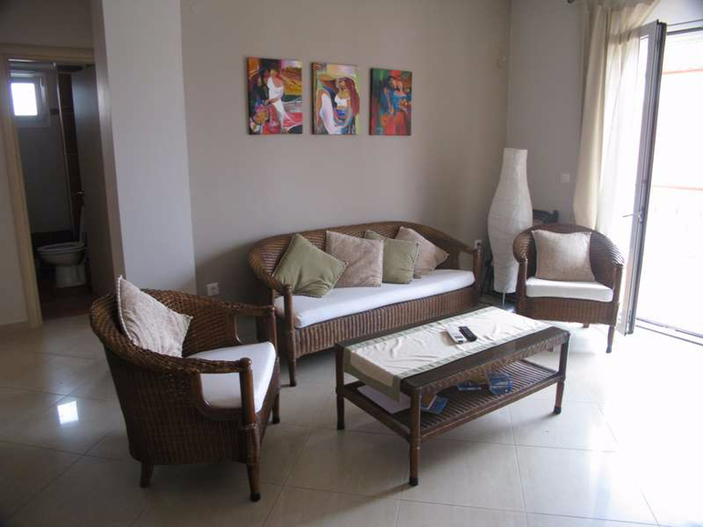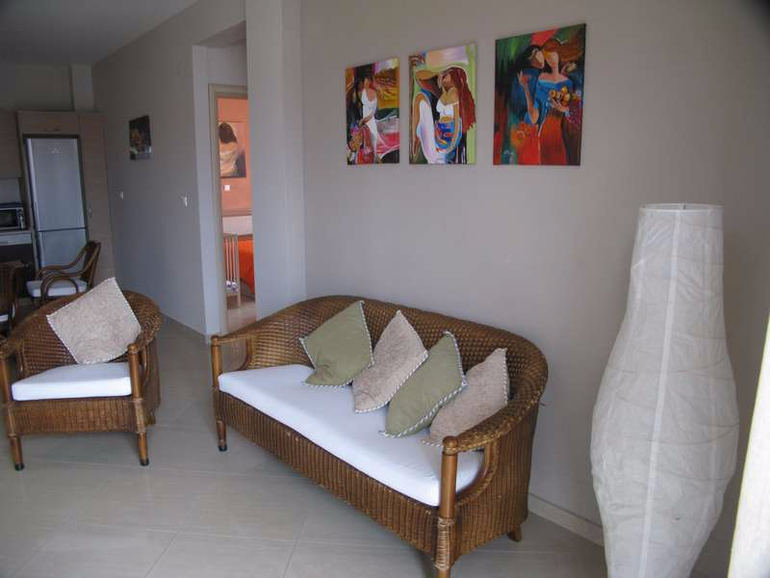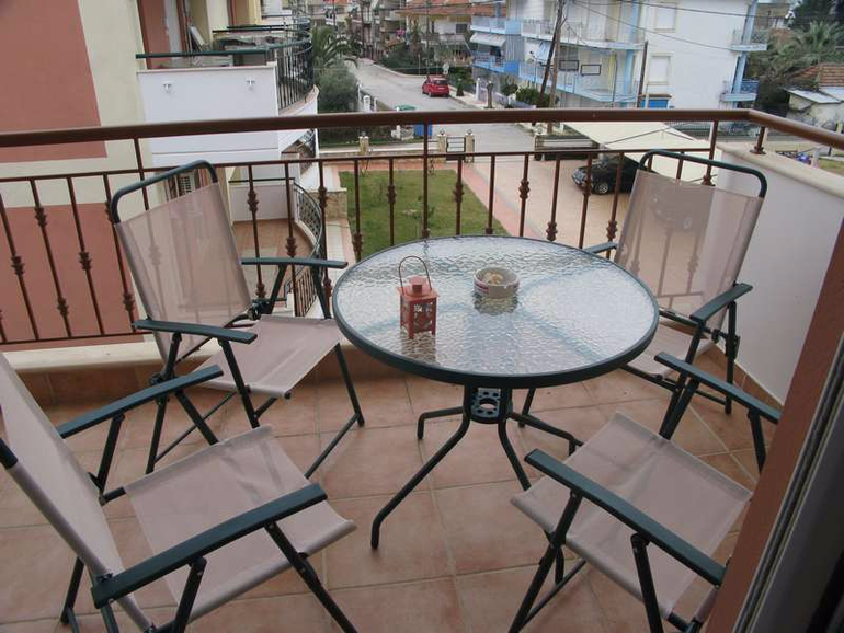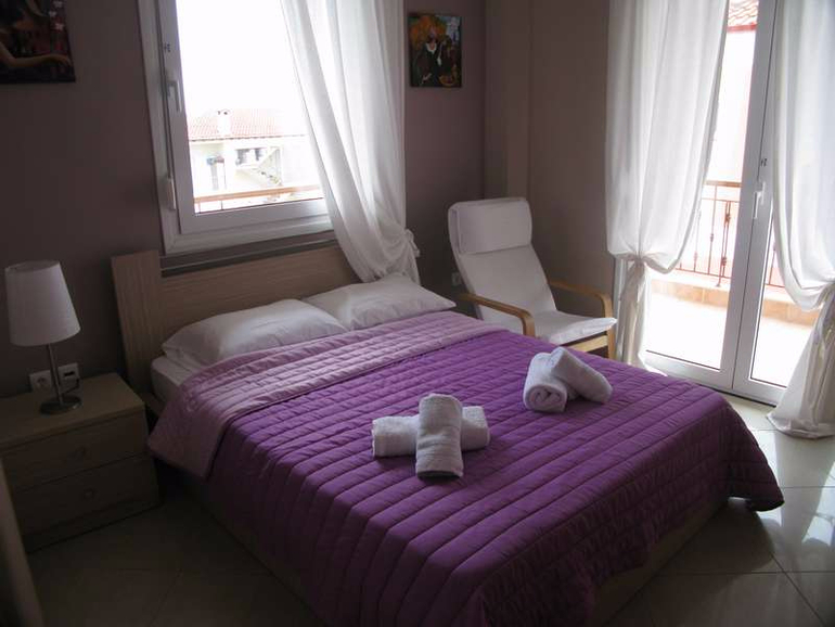 Расположены на третьем этаже. Состоят из гостиной и двух спальных комнат. Большой балкон с видом на оливковый сад. Ванная комната с душем. Полностью оборудованная кухня (плита, посудомоечная машина, посуда, чайник). Стиральная машина. Кондиционер в гостиной. ТВ, интернет. Паркинг. Барбекю. Внутренняя огороженная территория с газоном. В нескольких минутах ходьбы расположены несколько супермаркетов, мясная лавка, таверны и кафе, магазины. На набережной по вечерам работает луна-парк, есть детская площадка. Пляж оборудован шезлонгами и зонтиками. Имеется прокат водных видов спорта. Отличное место для спокойного отдыха с детьми. В этом же комплексе дверь в дверь имеется еще один аналогичный апартамент, поэтому можно приезжать с друзьями.