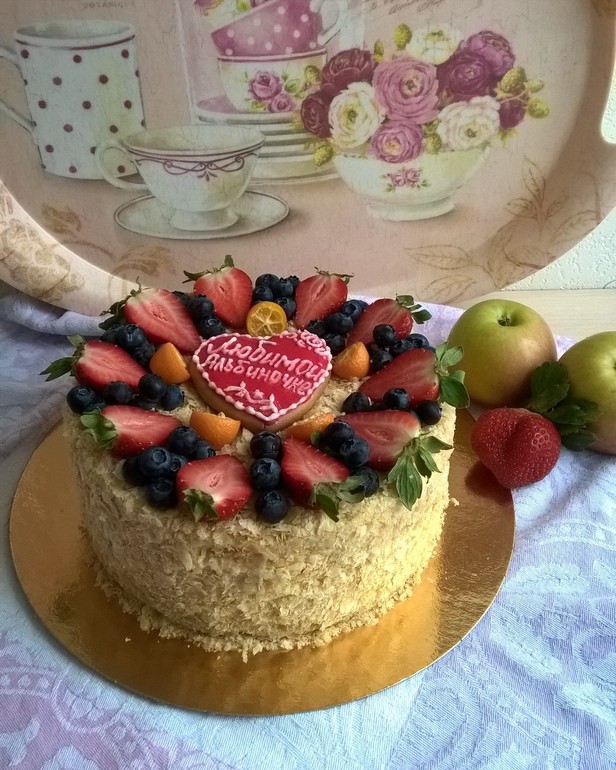 Наполеон - слоенное тесто с заварным кремом "пломбир", очень похожим на мороженное, получается мягкий и нежный торт. Украшается фруктами и/или шоколадом.