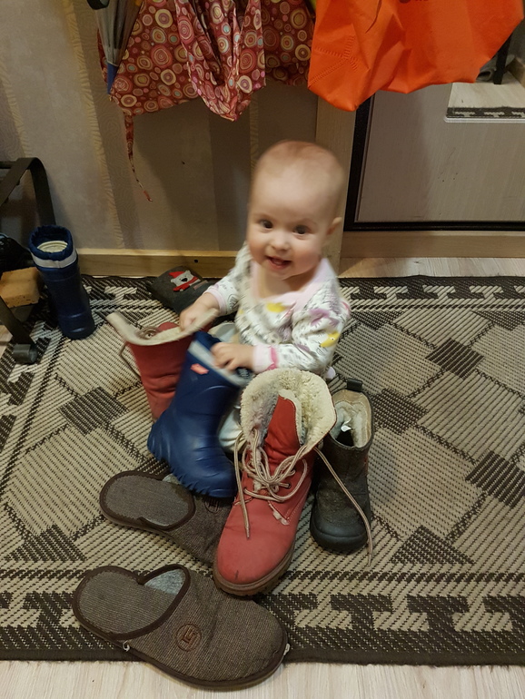 Маленькая помощница- снимает бельё с сушилки и подает мне, любит вытирать что-нибудь, разбирать шкафы. Несёт мне всё из коридора- шапку, варежки. Любит играть с грязной обувью, с чистой не интересно!