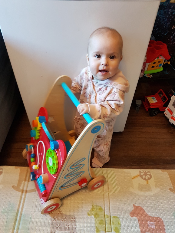 Мы до сих пор на активном гв. Ночью с меня не слезает. Отрастила 8 зубов, так что моей груди не сладко😣но пока так всё-таки удобнее. Говорит: мама, баба, папа, ляля, атя, алё, нана, дайдай. Любит ходить за ручку. Ровно в год сделала 5 шагов сама. Подарили каталку)