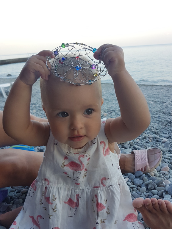 Ну принцесса и всё тут!!!))) Очень ранима и чувствительна к любому замечанию, при слове нельзя сразу делает грустный смайлик и ревет. В начале лета передёргивалась от любой букашки, мухи, муравьишки, потом привыкла. Наматывает на себя всё что сгодится как бусы. Любит одевать носки на руки как перчатки