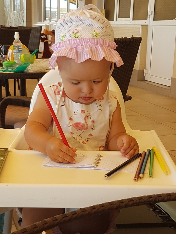 Очень любит рисовать, особенно ручкой. Выводит мелкие каракули. Любит всё вытирать тряпочкой.