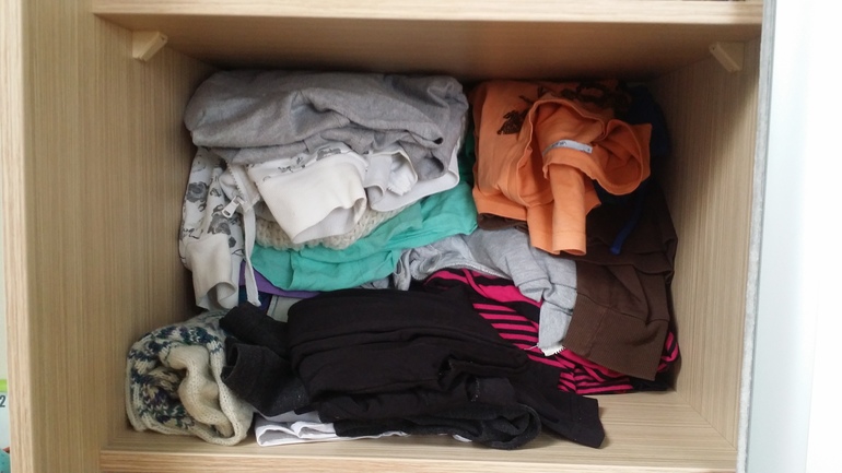 Передо мной полка с одеждой, которая давно не подвергалась ревизии и вопит о необходимости навести в ней порядок. На ней и буду проводить тест-драйв некоторых рекомендаций Марии Кондо.
