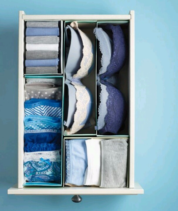 4. Убрать обратно по категориям. Можно использовать различные органайзеры для одежды или разделители для полок. Одежда складывается в органайзер вертикально. Для каждой категории используется отдельный отсек.