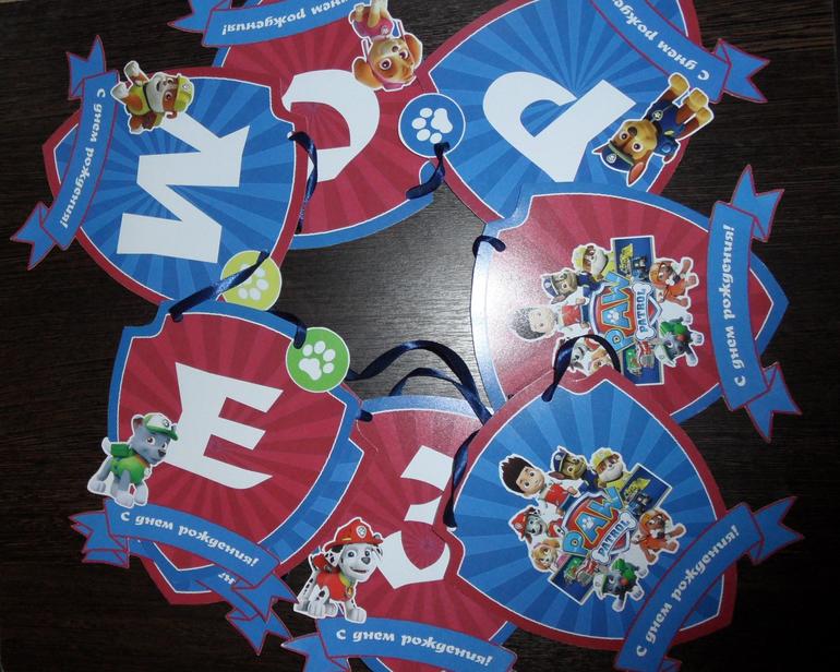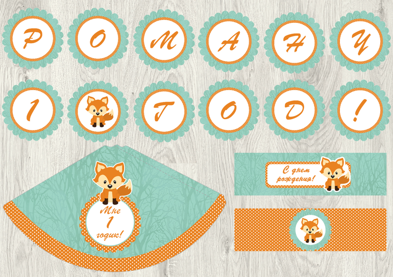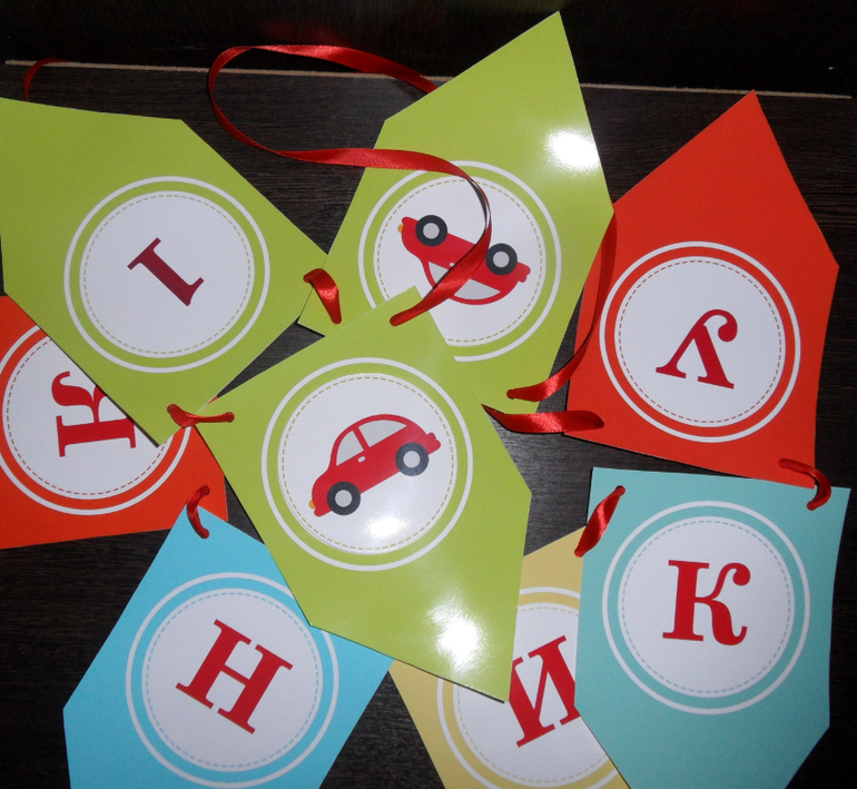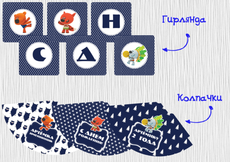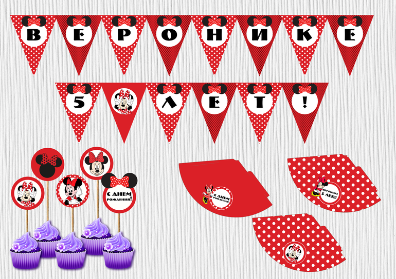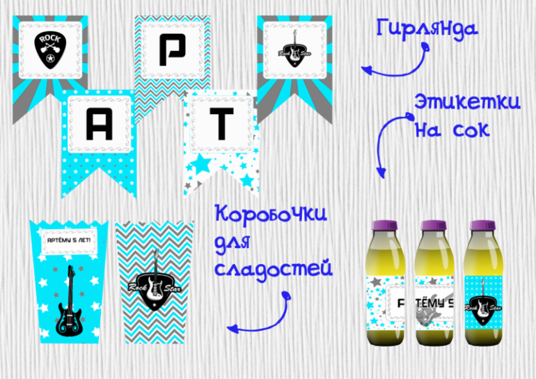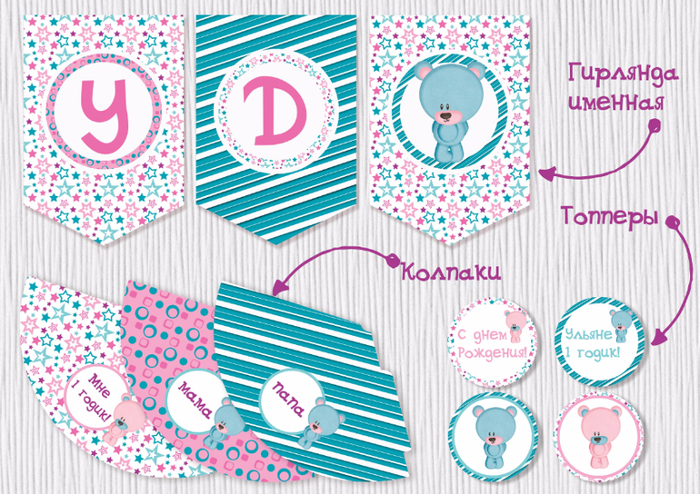 В набор вошли именная гирлянда, колпачки, приглашения, этикетки на сок, топперы, флажки, карточки на столы.