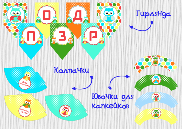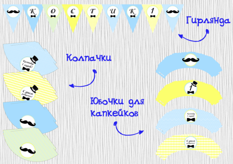 В набор вошли именная гирлянда, коробочки для сладостей, топперы на шпажках и на трубочки, обертки на шоколад и этикетки на сок. Также подготовили небольшой набор фотобутафории.