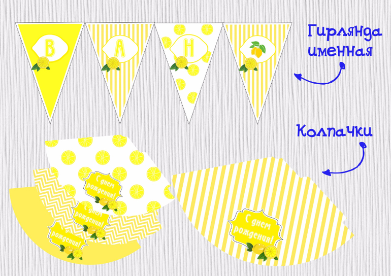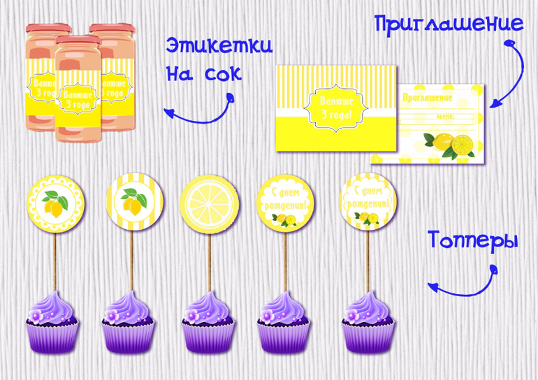 Яркий и сочный набор Лимончик. Возможны вариации цветов на лайм и апельсин. В набор вошли: приглашения, именная гирлянда, колпачки, топперы, юбочки для капкейков, этикетки на сок, обертки на шоколад.