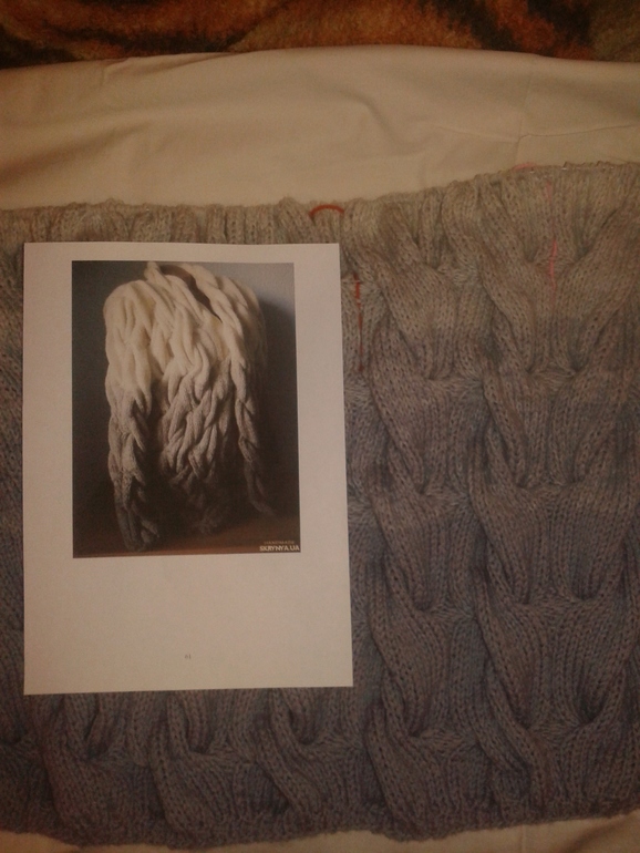 Я вяжу из пряжи Lanagold 800 1,3 кг. Надеюсь этого хватит на 44 размер. Вяжу в три нити с градиентом. У меня 12 кос 15х15.