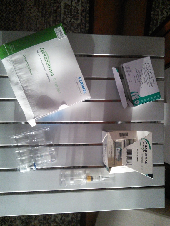 Декапептил, гонадотропин, андрогель полкоробки, капсула клексан и менопур. Все хранилось в холодильнике.