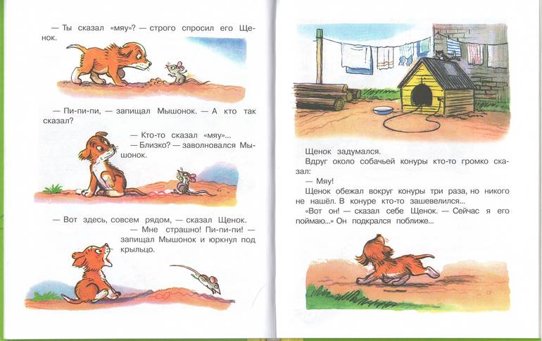 Это и самые простые истории в картинках для самых маленьких, почти не требующие текстового сопровождения "Три котенка", "Цыпленок и утенок", "Кораблик", "Кто сказал Мяу". Такие сказки прекрасно подходят для первого чтения, позже они же послужат прекрасным материалом для пересказывания по картинкам.