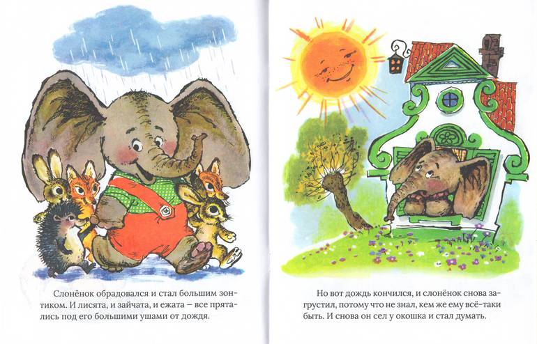 Чудесная сказка для самых маленьких о слоненке, который очень хотел быть полезным и помогать своим друзьям. Поучительная, добрая и забавная. Замечательные красочные иллюстрации, прекрасно отображающие настроение и эмоции героев сказки, из детства, слоник - просто милашка)