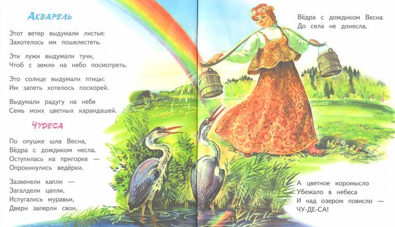 На 16 страничках собрано 9 прекрасных стихов о весне А.Пушкина, И.Бунина, Ф. Тютчева, А. Плещева, В. Жуковского и С. Черного. Подборка прекрасная. Иллюстрации мне тоже понравились - нежные, весенние, теплые, прекрасно отображающие общую тематику книжки. Много хорошо прорисованных деталей, природа изображена очень реалистично.