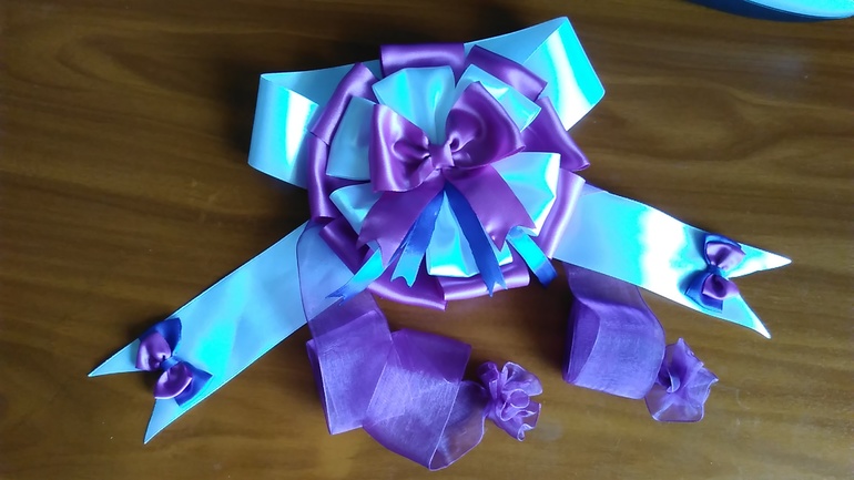 Осенило меня вчера, что хоть я нарядом на выписку и не заморачиваюсь особо, но пеленку или пледик надо же будет чем-то перевязать)) Из того, что было дома вышла вот такая штучка. Ленту сделала подвижную относительно банта, сиреневая для обмотки, а белая для красоты)